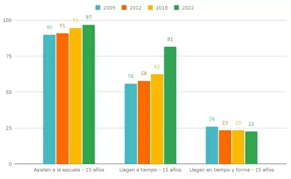 Aunque la Argentina muestra una muy alta tasa de asistencia escolar (97%) y 81 de cada 100 adolescentes están en el año que les corresponde, el panorama cambia al considerar los niveles de aprendizaje.